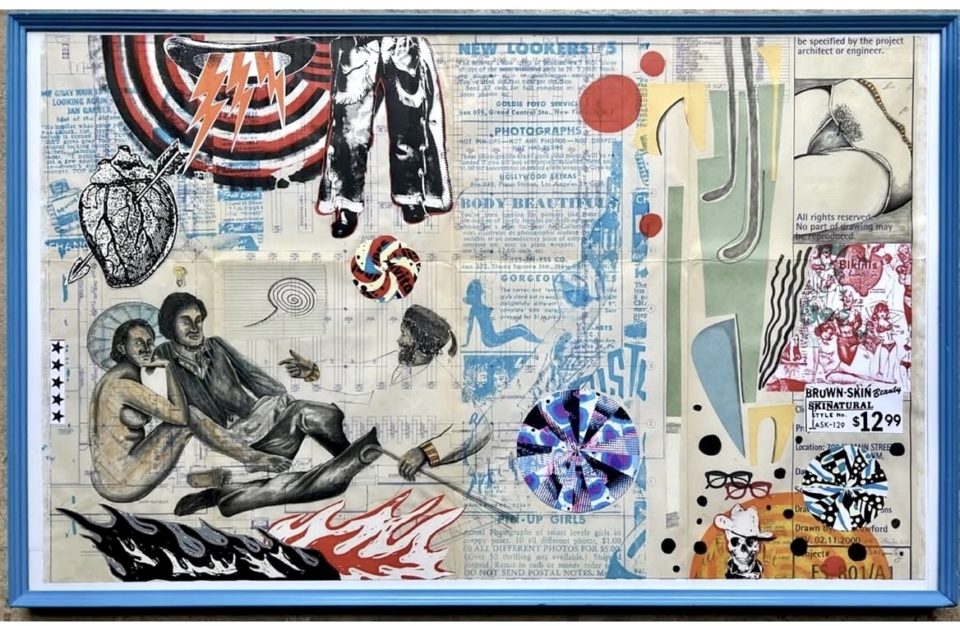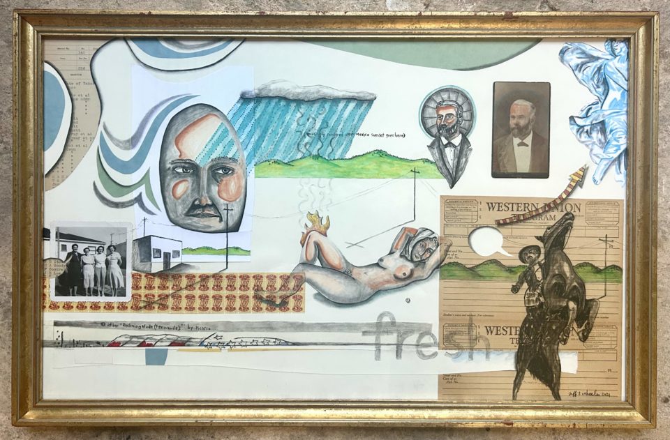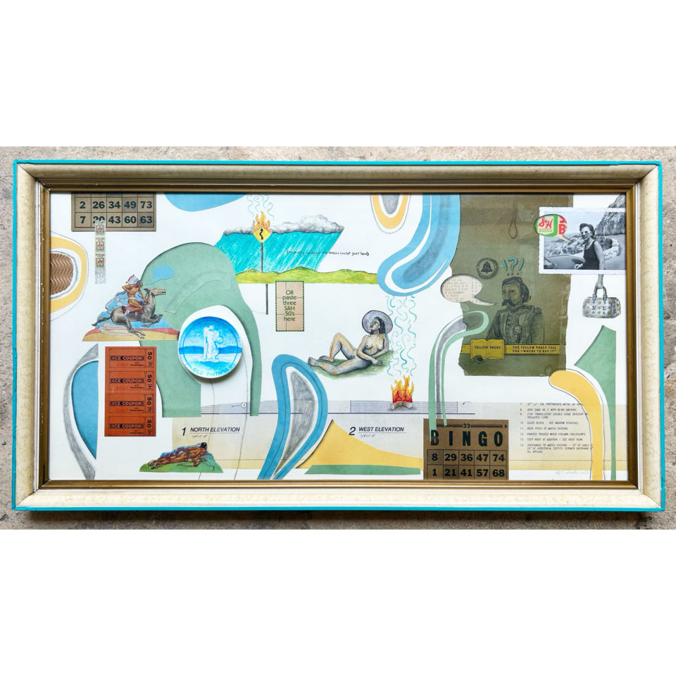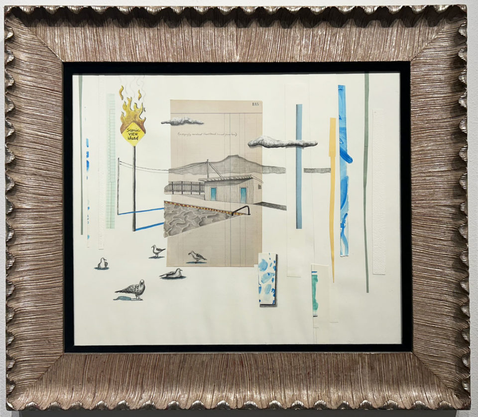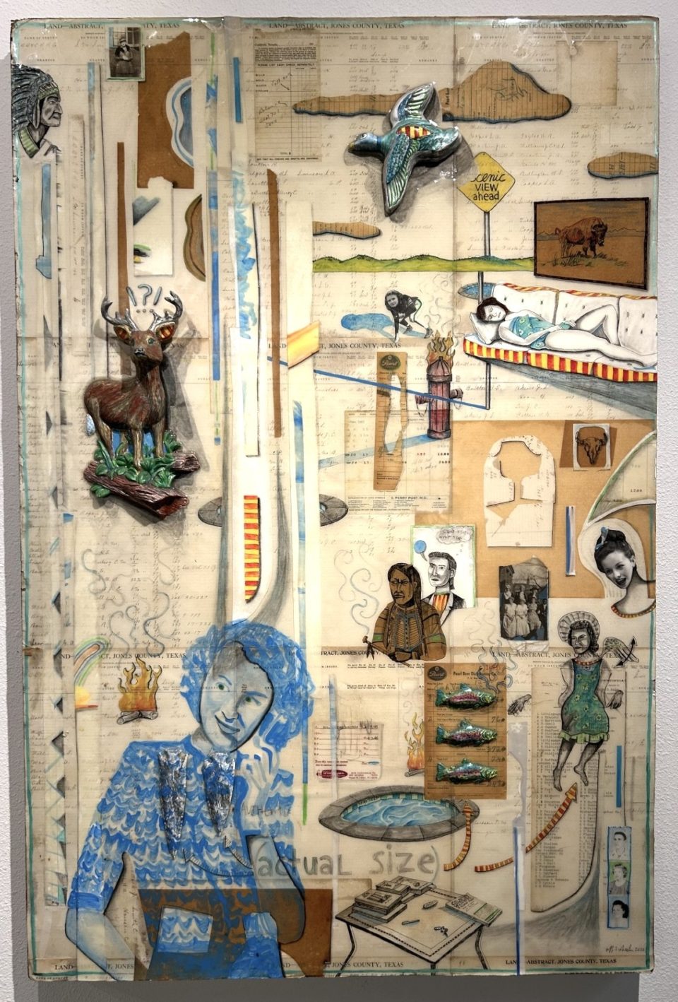 acrylic, charcoal, collage, and resin on ledger paper mounted to board