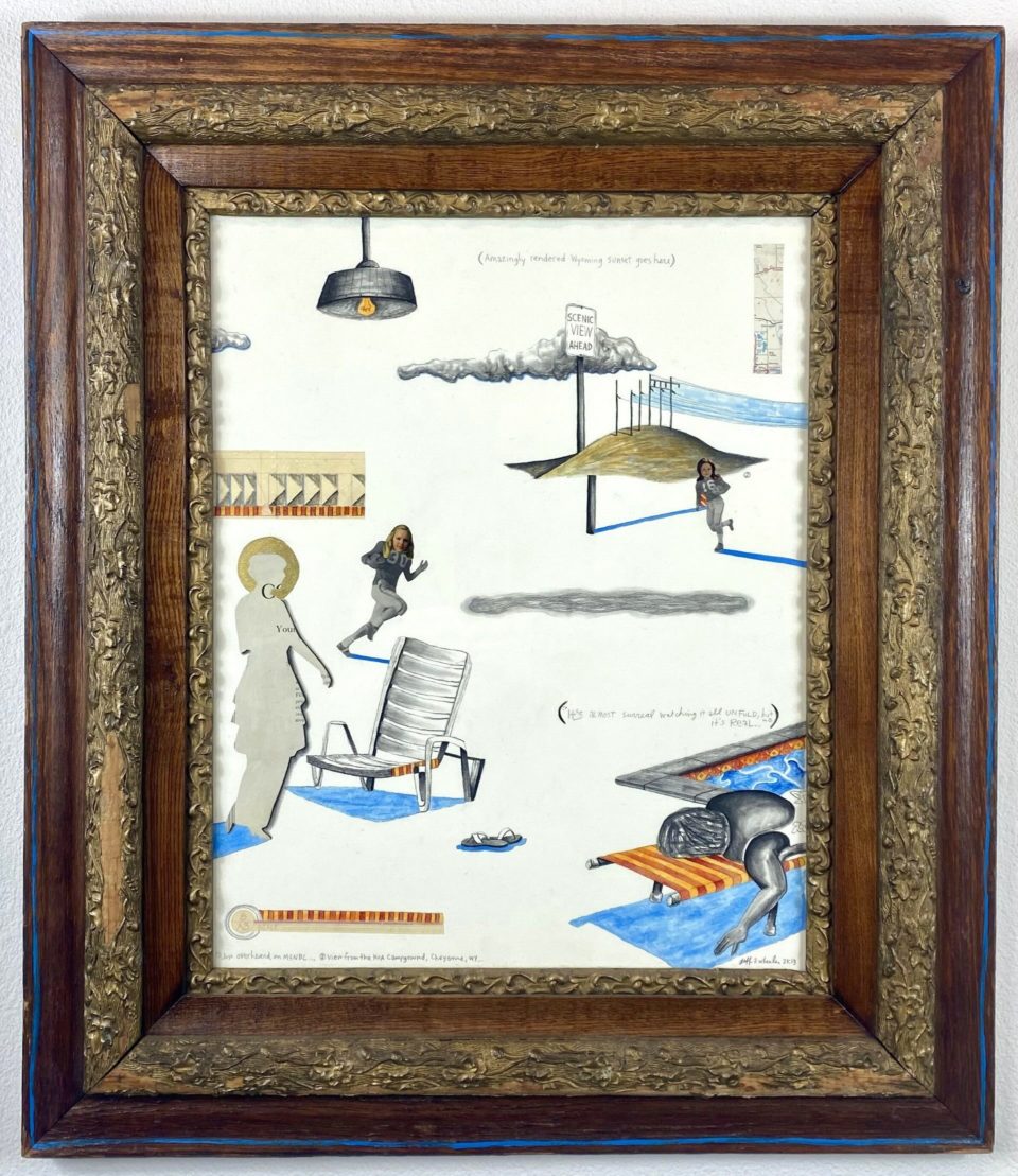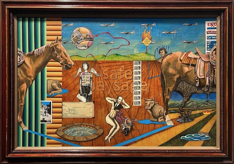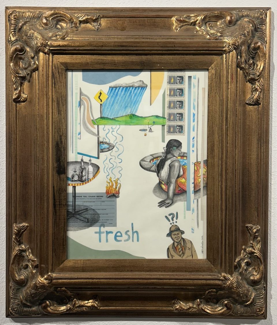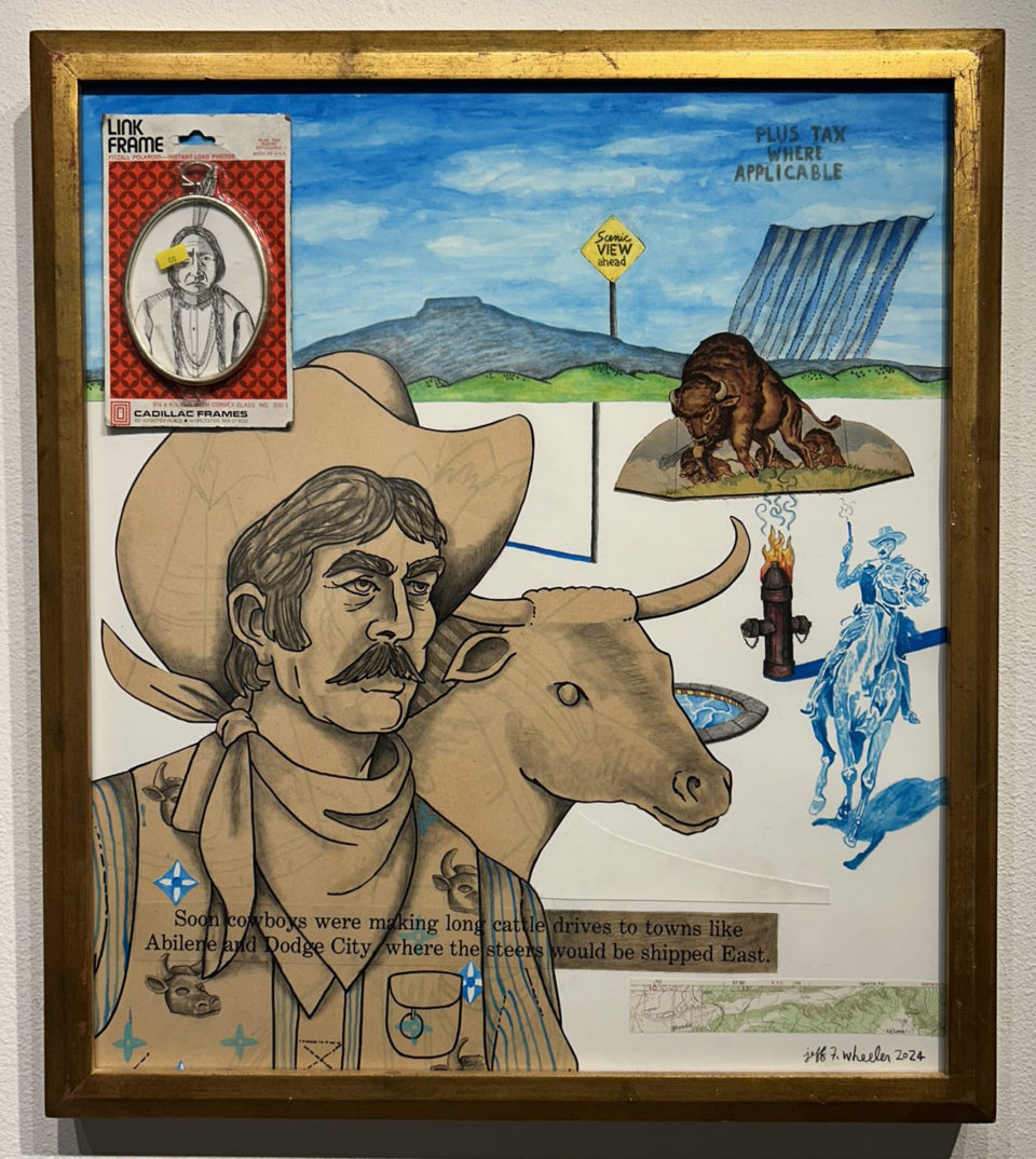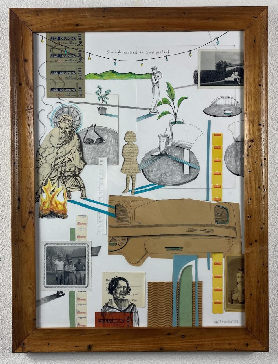 acrylic, charcoal, collage, and resin on ledger paper mounted to board