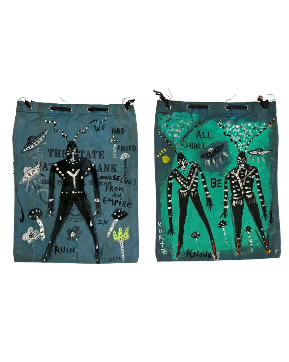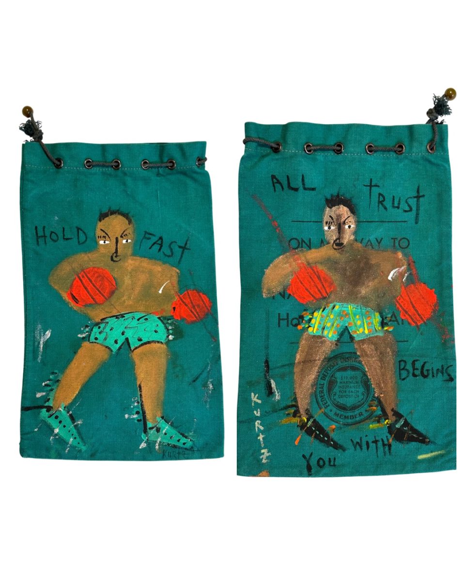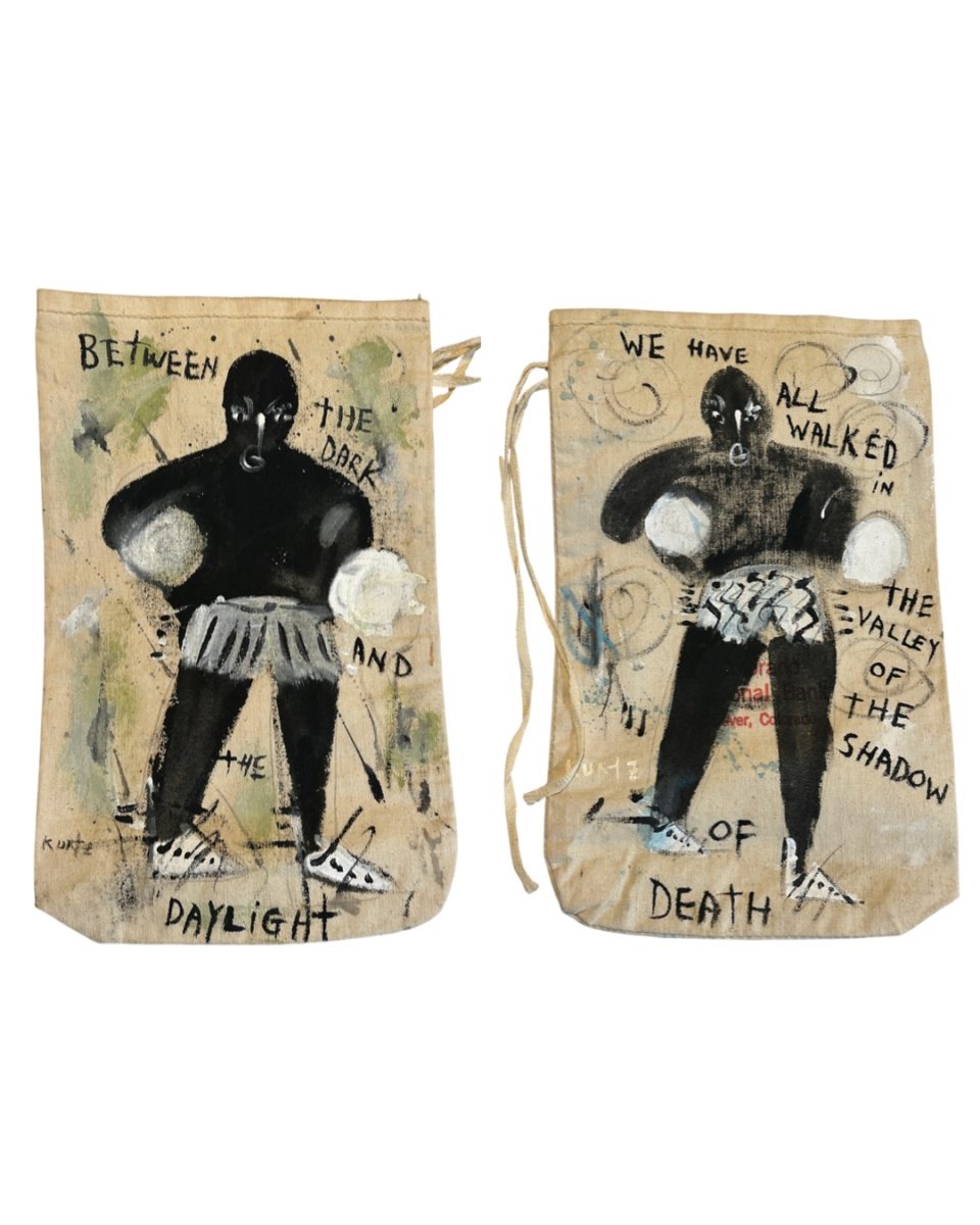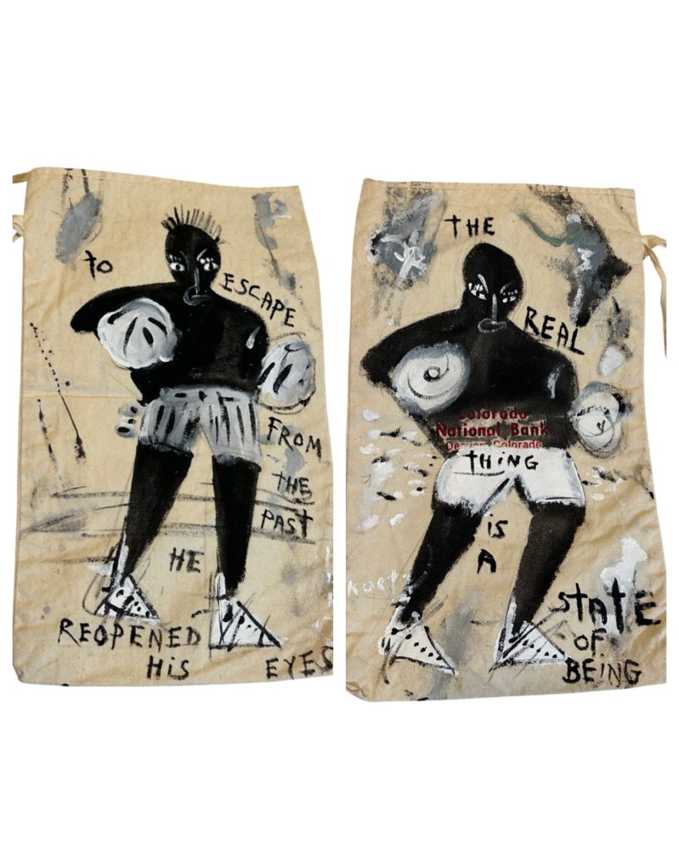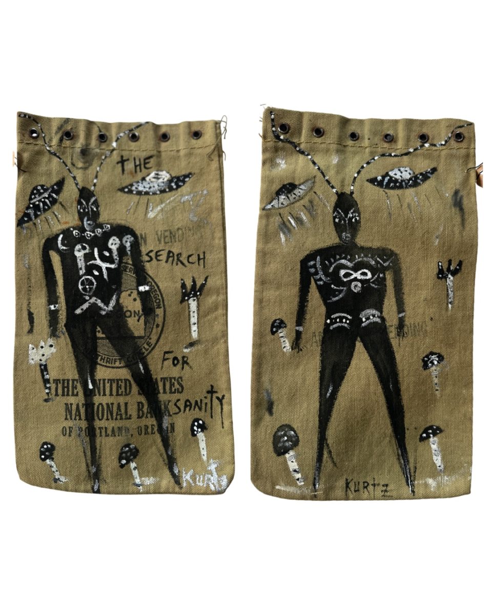 vintage military duck canvas, graphite, flashe, duffel bag, painted on both sides