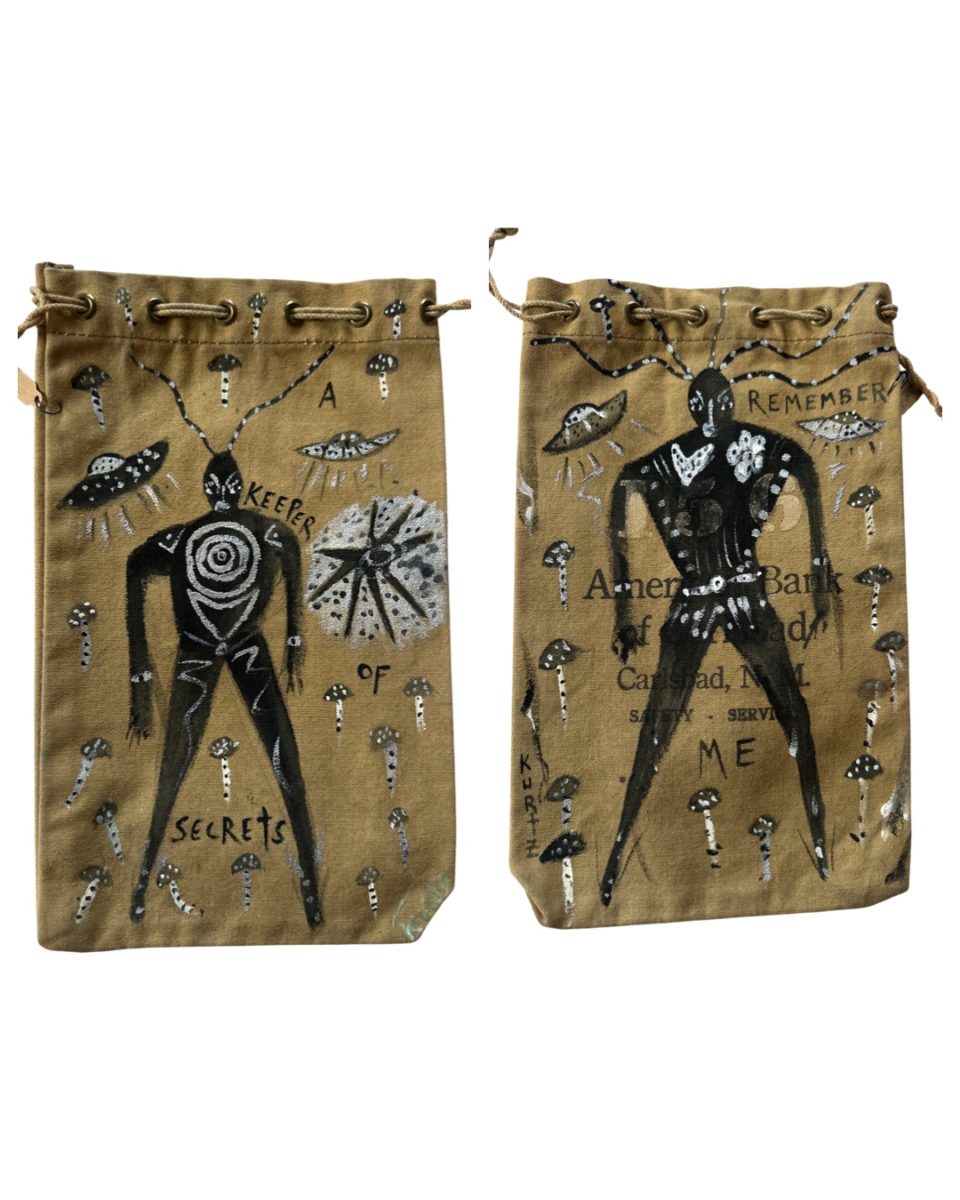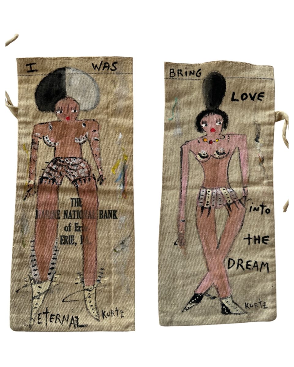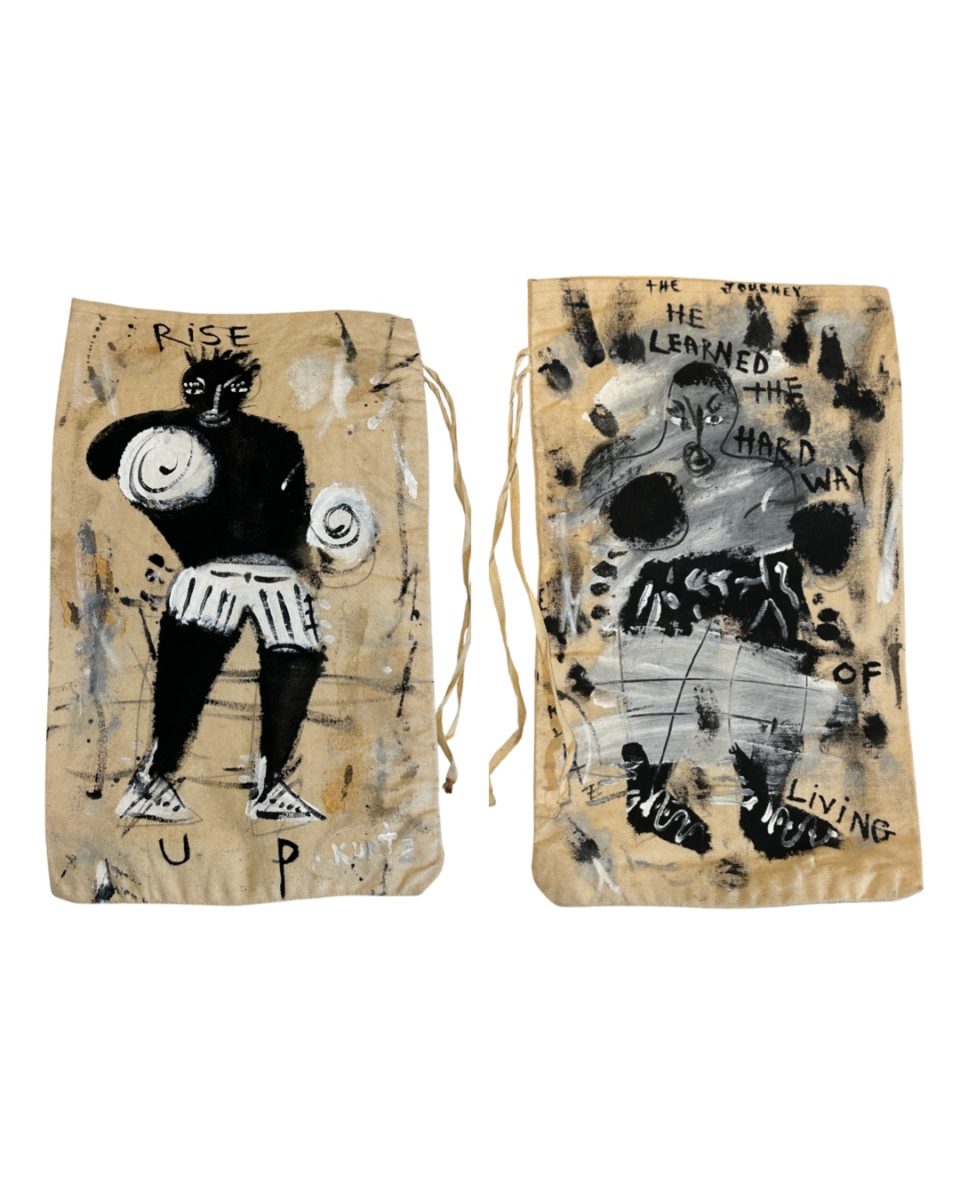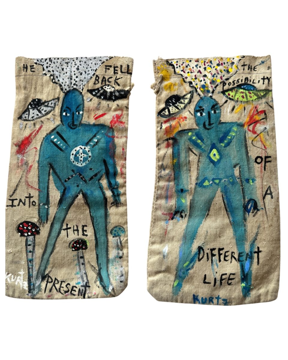 vintage military duck canvas, graphite, flashe, duffel bag, painted on both sides