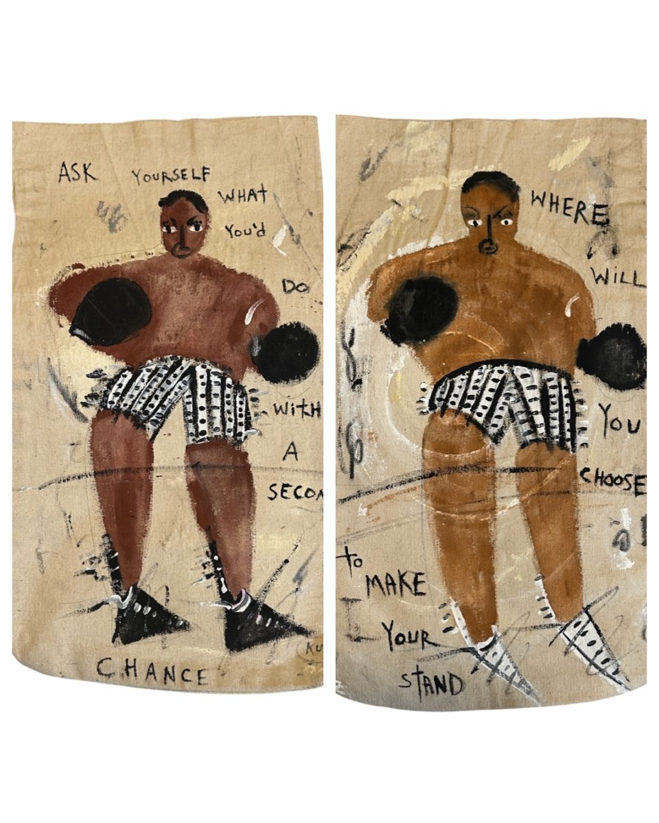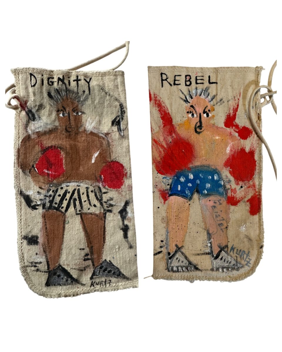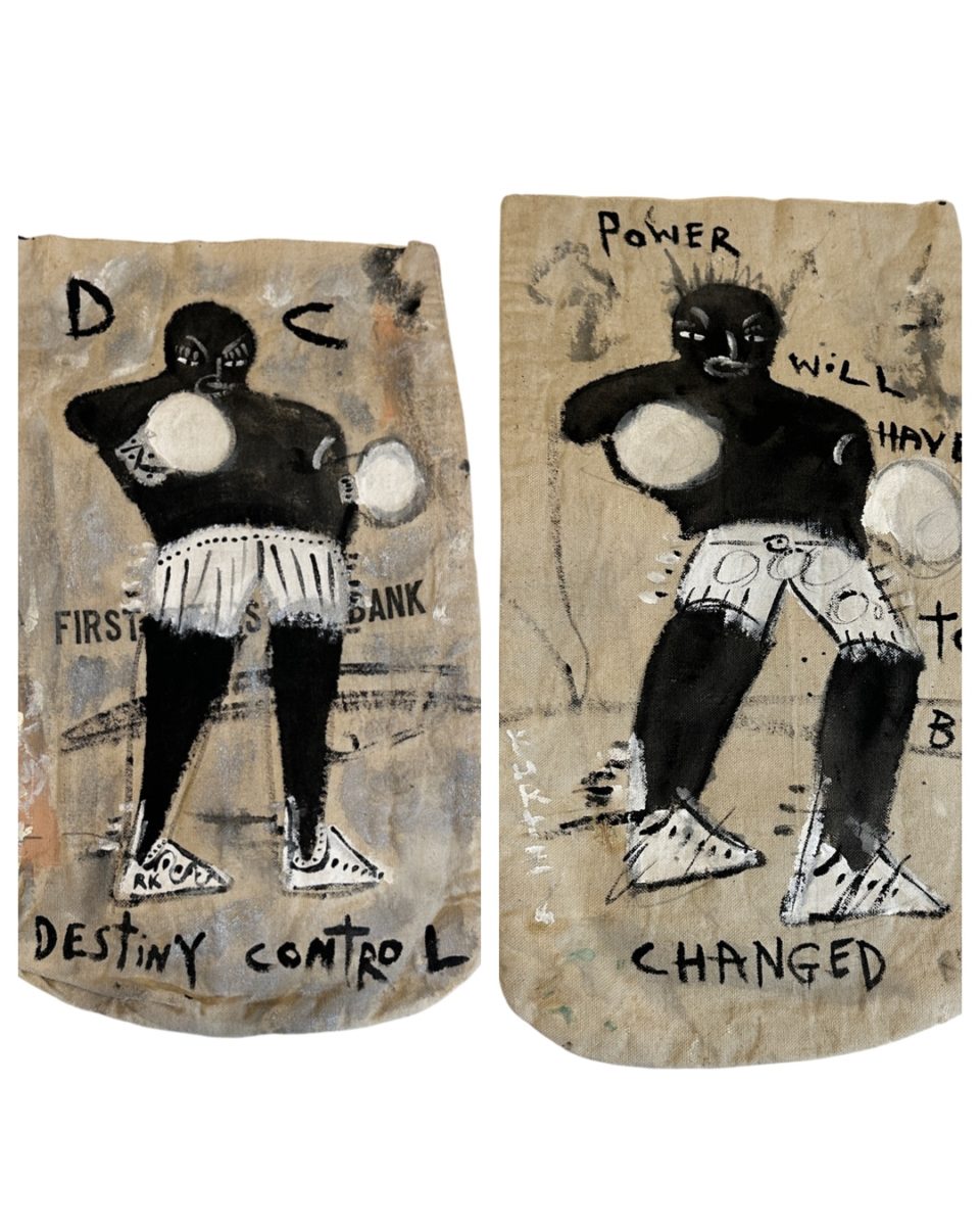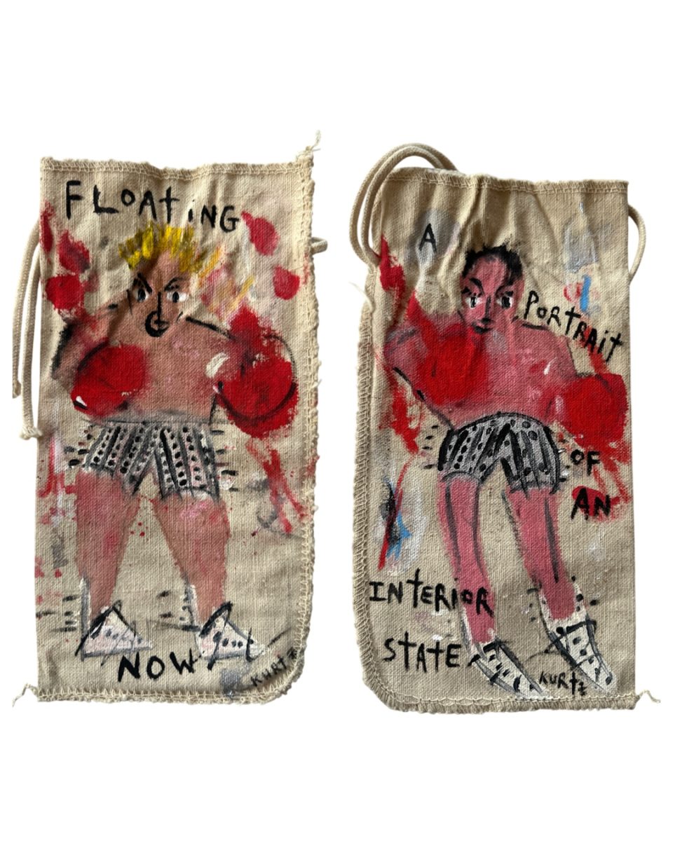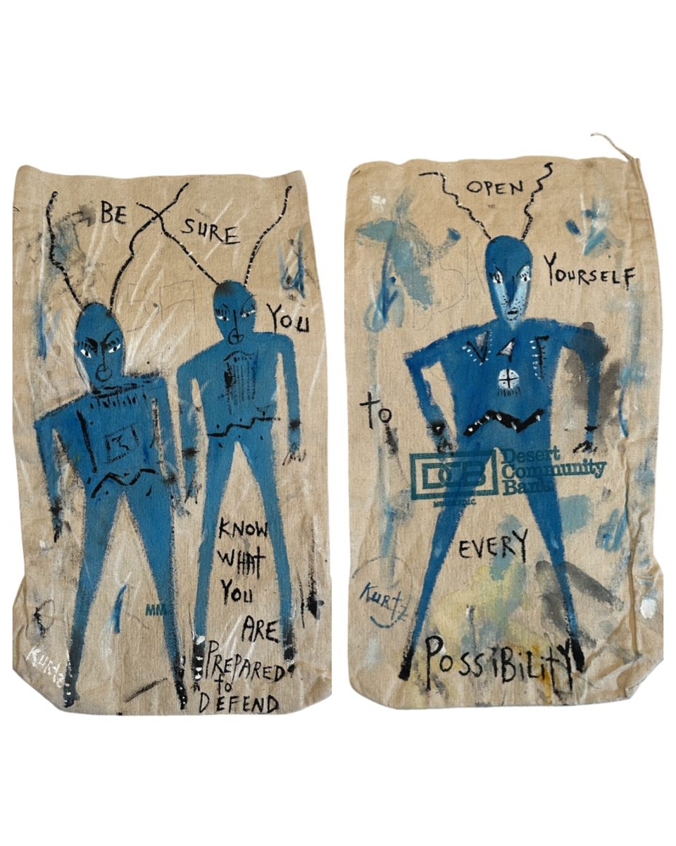 vintage military duck canvas, graphite, flashe, duffel bag, painted on both sides